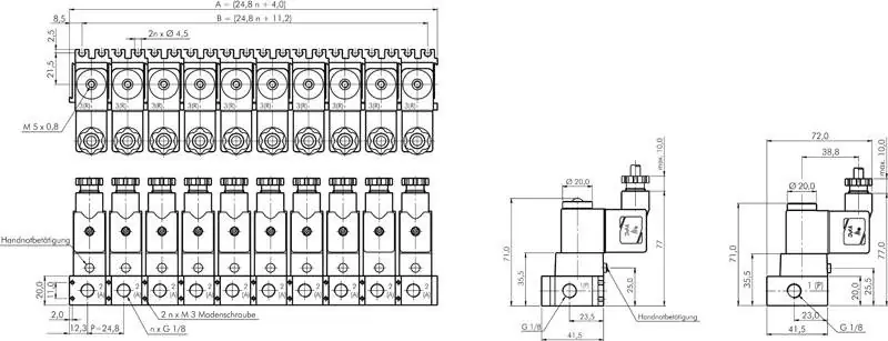 Durch die Schwalbenschwanzführung lassen sich die Ventile einfach, schnell und sicher ohne Zusatzbauteile verketten. •Dichtungsring plazieren, •Ventile ineinander stecken, •Verkettung durch Anziehen der Madenschrauben fixieren, Bei der Demontage lösen Sie einfach die Madenschrauben und ziehen das Ventil aus der Verkettung heraus.