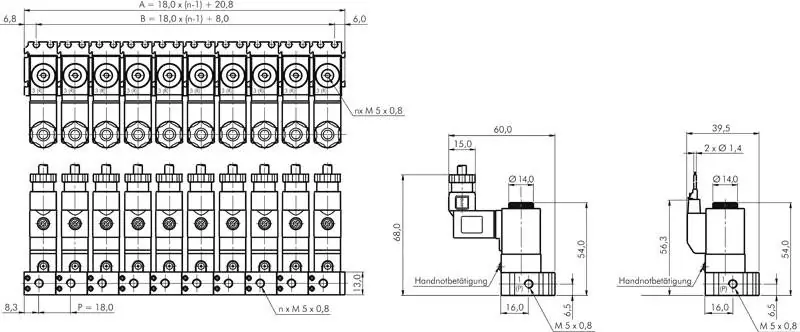 Durch die Schwalbenschwanzführung lassen sich die Ventile einfach, schnell und sicher ohne Zusatzbauteile verketten. •Dichtungsring plazieren, •Ventile ineinander stecken, •Verkettung durch Anziehen der Madenschrauben fixieren, Bei der Demontage lösen Sie einfach die Madenschrauben und ziehen das Ventil aus der Verkettung heraus.