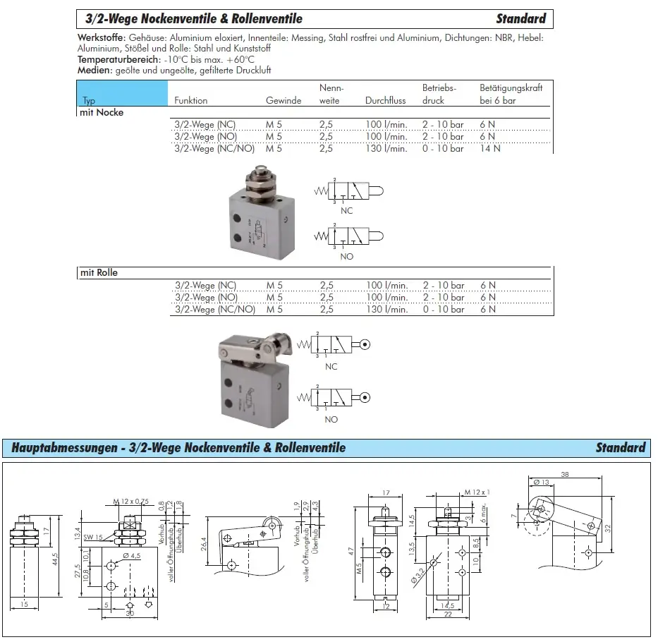 Die 3/2-Wege Nockenventile und Rollenventile Standard bieten eine zuverlässige mechanische Steuerung für pneumatische Systeme.