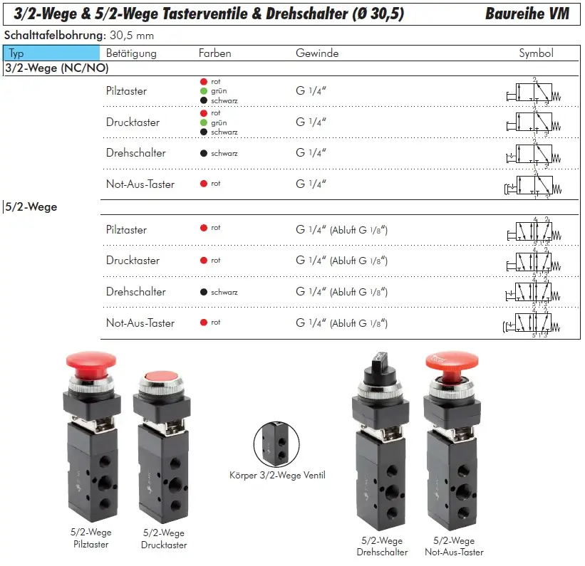 Die 3/2-Wege Tasterventile und Drehschalter der Baureihe VM von E-MC (Ø 30,5) bieten eine kompakte, robuste und präzise Lösung für manuelle Pneumatiksteuerungen.