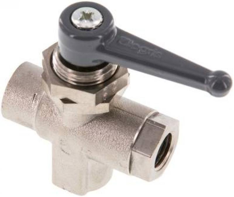 3-Wege T-Kugelhahn mit langem Griff für Schalttafeleinbau Messing vernickelt PN 20 alle Größen