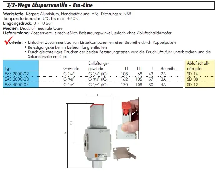 Pneumatik-Handabsperrventil Eco-Line – Mit Entlüftungsfunktion und Montagezubehör