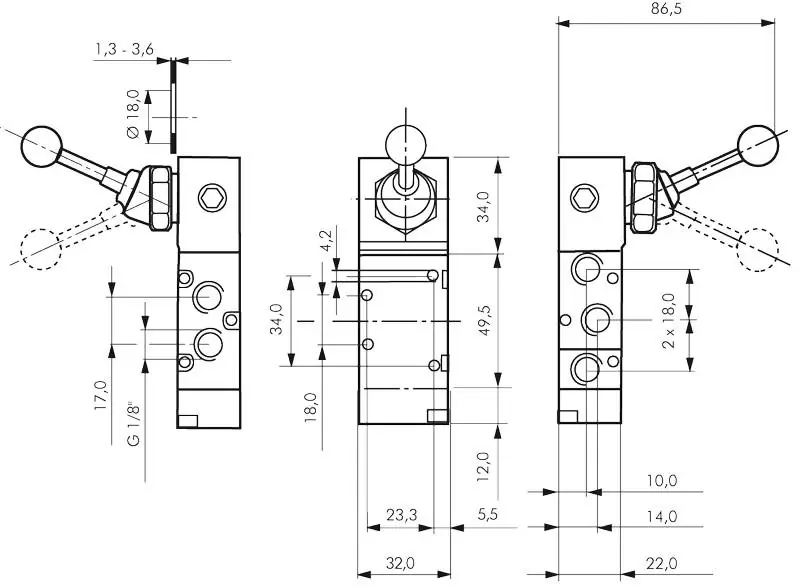 Die 5/2-Wege-Handhebelventile G 1/8" der Baureihe XMV 1000 Standard bieten eine zuverlässige manuelle Steuerung pneumatischer Systeme.