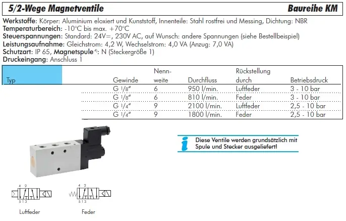 Die 5/2-Wege-Magnetventile der Baureihe KM AIRTEC bieten zuverlässige Steuerung von Pneumatikzylindern und industriellen Automatisierungsanlagen.