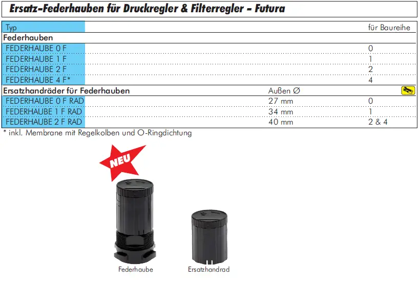 Schützen Sie das Herzstück Ihrer Druckluftregelung vor äußeren Einflüssen. Unsere originalen Ersatz-Federhauben für Aventics Druckregler und Filter-Druckregler der Serie Futura sind passgenau für alle Typen und Baureihen (0, 1, 2 und 4) verfügbar. Diese robuste Abdeckung gewährleistet, dass die empfindliche Regelfeder und die Justiermechanik sicher vor Staub, Schmutz und mechanischer Beschädigung geschützt sind.