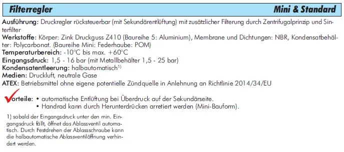 Werkstoffe: Körper: Zink Druckguss Z410 (Baureihe 5: Aluminium), Membrane und Dichtungen: NBR, Kondensatbehälter: Polycarbonat (Baureihe Mini: Federhaube: POM)