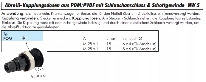 Gefertigt aus hochwertigem POM (Polyoxymethylen), ist diese Abreiß-Kupplung resistent gegenüber vielen aggressiven Medien und Reinigungsmitteln. Sie eignet sich hervorragend für den Einsatz in der Labortechnik, Medizintechnik und im allgemeinen Industriebedarf, wo Hygiene und Materialbeständigkeit im Vordergrund stehen. Die Kombination aus Schottgewinde für die Panelmontage und Überwurfmutter für die rückseitige, feste Rohrverschraubung bietet maximale Flexibilität bei der Installation.