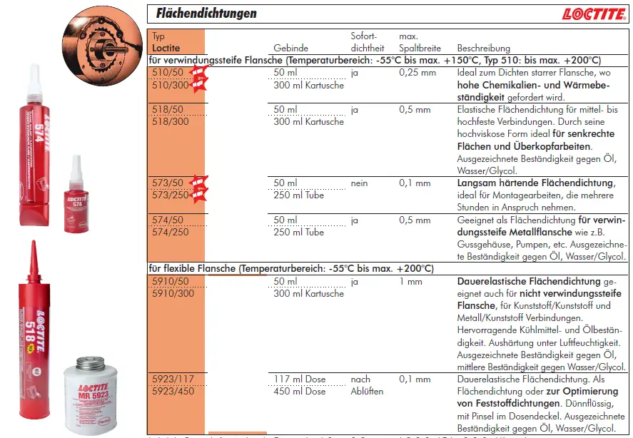 LOCTITE® 574 & 573: Die Standards für starre Metallflansche. 574 ist schnellhärtend, während 573 durch seine langsame Aushärtung ideal für große Bauteile und lange Montagezeiten ist.