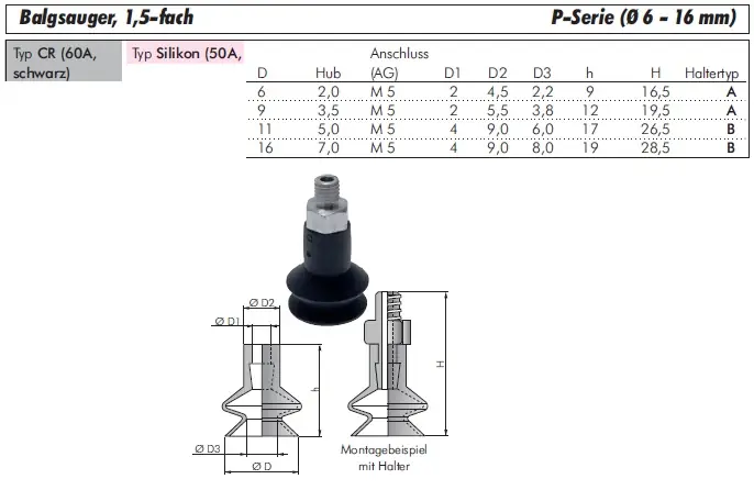 Balgsauger 1,5-fach P-Serie (ohne Halter), Ø 6 - 16 mm, alle Typen