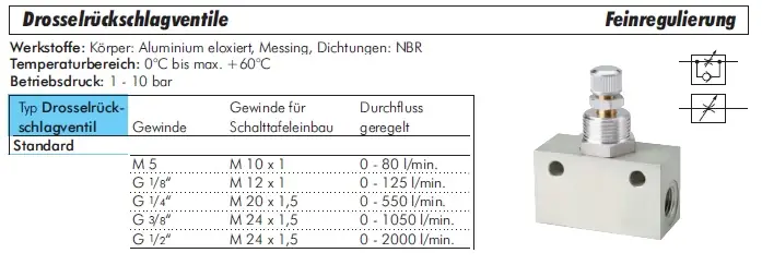 Gefertigt aus vernickeltem Messing für das Gehäuse und mit widerstandsfähigen NBR-Dichtungen ausgestattet, sind die Ventile medienbeständig gegen geölte/ungeölte Druckluft, neutrale Gase, Wasser und diverse Öle. [1] Sie bieten eine zuverlässige Druckfestigkeit von bis zu 16 bar (PN16) bei einem Temperaturbereich von -20°C bis +80°C. Die feinfühlige Justierung per Rändelschraube ermöglicht eine exakte Anpassung der Strömungsgeschwindigkeit.