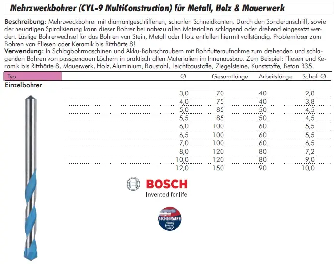 Beschreibung: Mehrzweckbohrer mit diamantgeschliffenen, scharfen Schneidkanten. Durch den Sonderanschliff, sowie der neuartigen Spiralisierung kann dieser Bohrer bei nahezu allen Materialien schlagend oder drehend eingesetzt werden. Lästige Bohrerwechsel für das Bohren von Stein, Metall oder Holz entfallen hiermit vollständig. Problemlöser zum Bohren von Fliesen oder Keramik bis Ritzhärte 8!