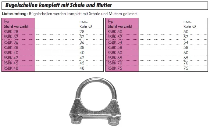 Lieferumfang: Bügelschellen werden komplett mit Schale und Muttern geliefert.