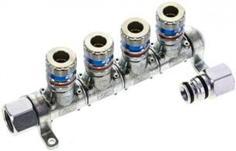 Druckluftverteilsystem komplett montiert mit einzeln schwenkbaren Standardkupplungen NW 7,2. Im Lieferumfang ist ein optional montierbarer Gewindeausgang (G 1/2") zur Verkettung mehrerer Blöcke enthalten.