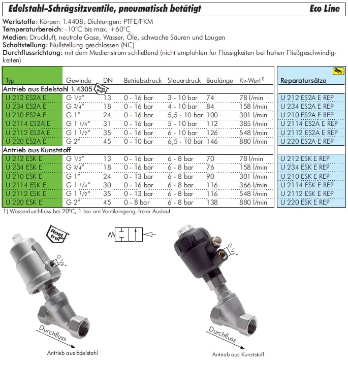 Die Schrägsitzventile aus Edelstahl Eco-Line sind pneumatisch bestätigt und bieten eine zuverlässige Steuerung von Flüssigkeiten und Gasen. Die Schrägsitzkonstruktion gewährleistet minimale Druckverluste, dichte Absperrung und lange Lebensdauer.