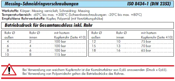 Bei Verwendung von weichem Kupferrohr ist der Korrekturfaktor von 0,65 anzuwenden (Druck x 0,65). Bei Verwendung von Polyamidrohr gelten die Betriebsdrücke des Rohres.