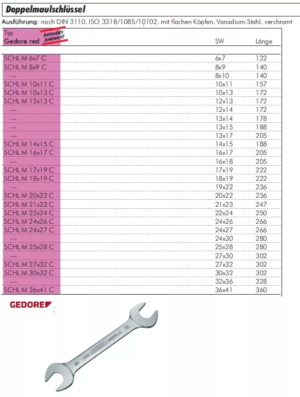 Die Doppelmaulschlüssel von Gedore Red® in allen Größen bieten zuverlässige Qualität für den täglichen Einsatz in Werkstatt, Handwerk und Service. Als praxisorientierte Produktlinie von Gedore stehen Gedore Red® Werkzeuge für robuste Verarbeitung, präzise Passform und ein ausgezeichnetes Preis-Leistungs-Verhältnis. Die beidseitigen Maulöffnungen ermöglichen effizientes Arbeiten bei unterschiedlichsten Schraubverbindungen.