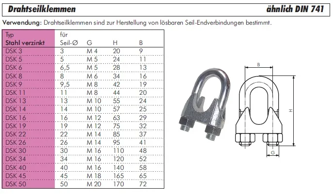 Verwendung: Drahtseilklemmen sind zur Herstellung von lösbaren Seil-Endverbindungen bestimmt.