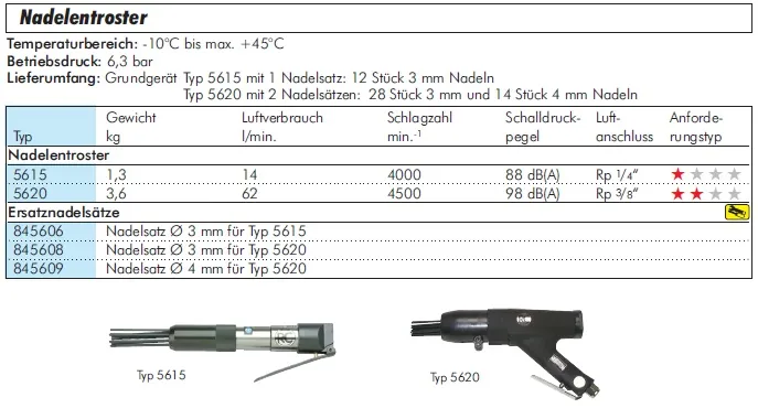 Die Druckluft-Nadelentroster in verschiedenen Typen ermöglichen ein schnelles, effizientes und präzises Entrosten von Metalloberflächen, Guss- oder Schweißteilen. Unterschiedliche Typen und Nadelkonfigurationen erlauben die optimale Anpassung an leichte, mittlere oder schwere Entrostungsarbeiten. Pneumatischer Antrieb sorgt für konstant hohe Leistung bei dauerhafter Nutzung in Werkstatt, Produktion oder Industrie.