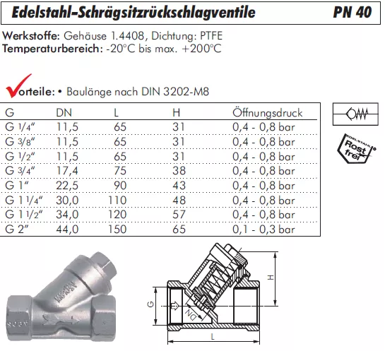 Die Edelstahl-Schrägsitzrückschlagventile PN 40 verhindern zuverlässig den Rückfluss von Flüssigkeiten oder Gasen in Pneumatik-, Hydraulik- und Prozessanlagen.