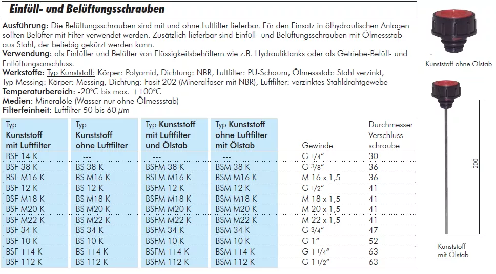 Ausführung: Die Belüftungsschrauben sind mit und ohne Luftfilter lieferbar. Für den Einsatz in ölhydraulischen Anlagen sollten Belüfter mit Filter verwendet werden. Zusätzlich lieferbar sind Einfüll- und Belüftungsschrauben mit Ölmessstab aus Stahl, der beliebig gekürzt werden kann.