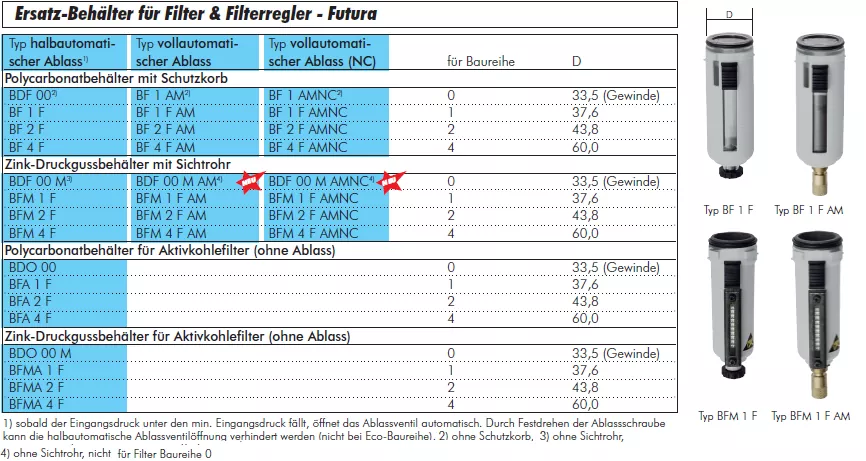 Alle Ersatz-Behälter sind präzisionsgefertigt und lassen sich dank des Futura-Bajonettverschlusses oder der entsprechenden Befestigung einfach und schnell austauschen. Vertrauen Sie auf Original-Ersatzteile von Emerson Aventics, um die Druckfestigkeit und Lebensdauer Ihrer Wartungseinheiten zu garantieren. Wir liefern alle Baugrößen direkt ab Lager – für minimale Stillstandzeiten in Ihrer Produktion!