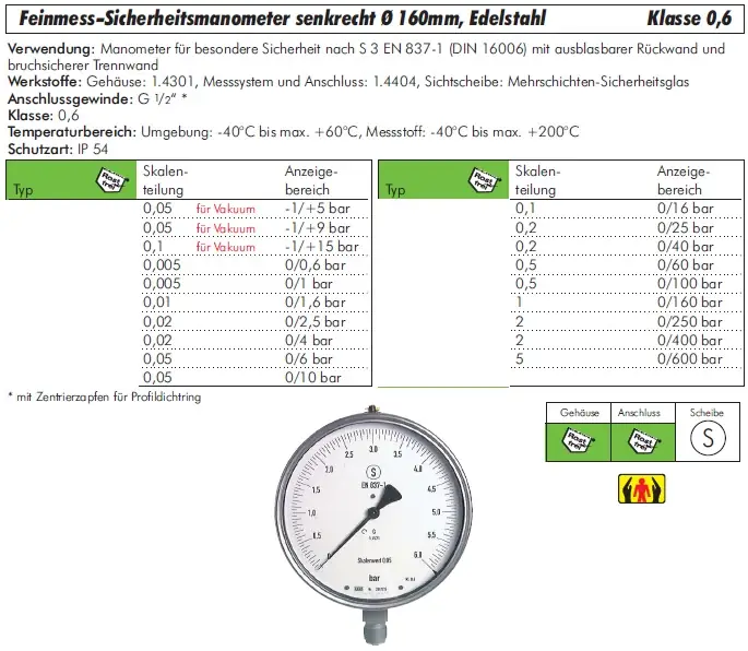 Verwendung: Manometer für besondere Sicherheit nach S 3 EN 837-1 (DIN 16006) mit ausblasbarer Rückwand und bruchsicherer Trennwand