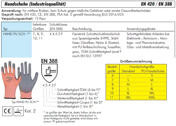 Normgerechter Schutz: CE-zertifiziert nach EN 388 (oft Level C oder D) für geprüfte Sicherheit.