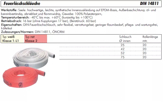 Eigenschaften: DIN-Feuerlöschschlauch, sehr flexibel, verrottungsfest, geringer Raumbedarf, kältefest