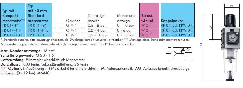 Ausführung: Druckregler rücksteuerbar (mit Sekundärentlüftung) mit zusätzlicher Filterung durch Zentrifugalprinzip und Sinterfilter