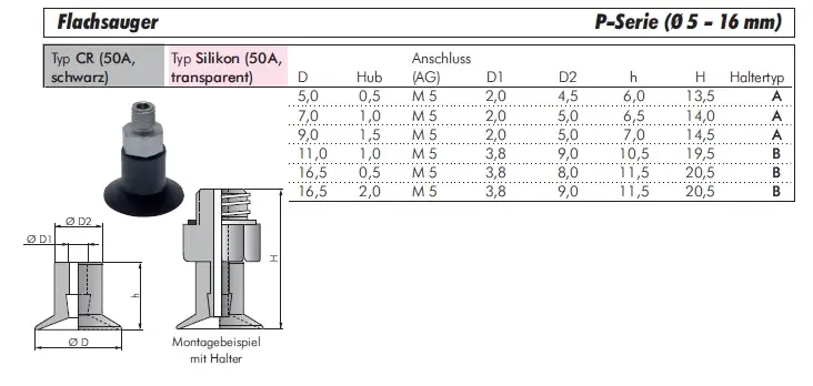 Wählen Sie jetzt den idealen Flachsauger (P-Serie) im Durchmesserbereich 5–16 mm für Ihre spezifische Automatisierungsaufgabe und steigern Sie die Effizienz Ihrer Handhabungsprozesse!