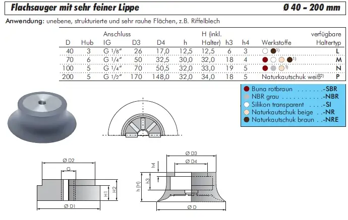 Flachsauger mit sehr feiner Lippe (ohne Halter), Ø 40-200 mm, alle Typen. Präzise gefertigt, langlebig und zuverlässig für industrielle Vakuum- und Pneumatik-Anwendungen.