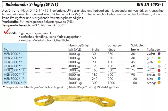 Nach DIN EN 1492-1 gefertigte, UV-beständige und farbcodierte Hebebänder mit verstärkten Kranschlaufen und eingewebten Tonnenstreifen, Sicherheitsfaktor (SF) 7:1. Keine Feuchtigkeitsaufnahme in den Gurtfasern, daher keine Frostgefahr und weitgehende Verrottungsbeständigkeit.