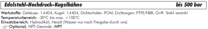 Hochdruck Kugelhahn für Drücke bis 500 bar