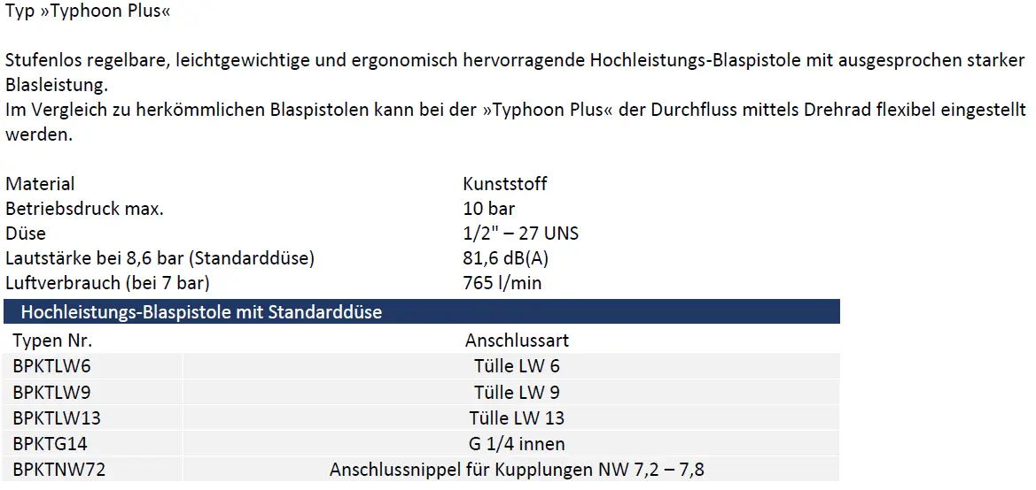 Die Hochleistungs‑Ausblaspistolen TYPHOON PLUS aus Kunststoff sind regelbare, leistungsstarke Druckluft‑Blaspistolen für professionelle Reinigungs‑, Trocknungs‑ und Ausblasarbeiten in Werkstatt, Industrie und Gewerbe. Durch den stufenlos einstellbaren Durchfluss über ein Drehrad lässt sich die Luftmenge exakt an die jeweilige Aufgabe anpassen – von feinen Reinigungsarbeiten bis zu kräftigem Ausblasen grober Rückstände. Gegenüber Standard‑Blaspistolen bieten sie eine deutlich stärkere Blasleistung bei ergonomisch geringem Gewicht.