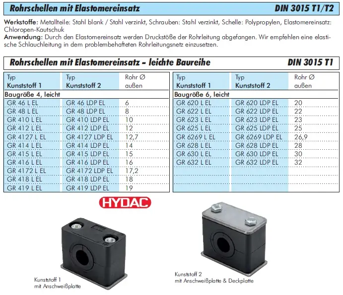 Leichte Hydac Rohrschellen mit Elastomereinsatz DIN 3015 T1 für Industrie und Maschinenbau
