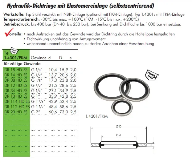 Für höchste Ansprüche in der Hydraulik und im Maschinenbau, insbesondere bei internationalen (zölligen) Anschlüssen und aggressiven Betriebsbedingungen: Unsere innovativen, selbstzentrierenden Hydraulik-Dichtringe mit integrierter FKM-Elastomer-Einlage (Viton®) bieten eine unübertroffene Dichtleistung. Das clevere Design sorgt dafür, dass sich der Dichtring beim Anziehen der Verschraubung automatisch perfekt ausrichtet und so Montagefehler ausschließt. Die FKM-Lippe dichtet zuverlässig ab und ist extrem beständig gegen Chemikalien, während der robuste Metallkörper hohen Drücken standhält. Wir führen ein umfassendes Sortiment in allen gängigen zölligen Größen (z.B. für G-Gewinde, UNF, NPT).