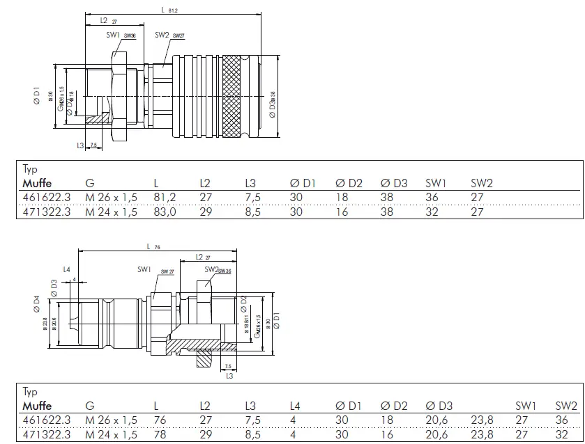 Die Anbindung an das Hydraulikrohr erfolgt über einen 24°-Konus nach ISO 8434-1 (DIN 2353). Die Kupplung verfügt über ein Schottgewinde mit Kontermutter für eine einfache und sichere Montage in der Durchführung. Wir bieten diese Kupplungen in allen gängigen Größen (DN 6 bis DN 25) an.