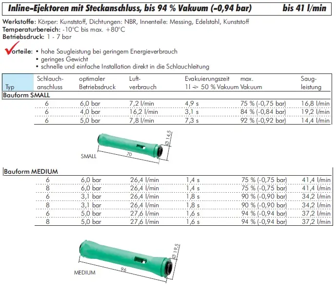 Inline-Ejektoren mit Steckanschluss bis 94 % Vakuum (-0,94 bar), bis 41 l/min, alle Typen