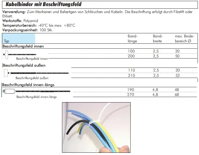 Verwendung: Zum Markieren und Befestigen von Schläuchen und Kabeln. Die Beschriftung erfolgt durch Filzstift oder Etikett.