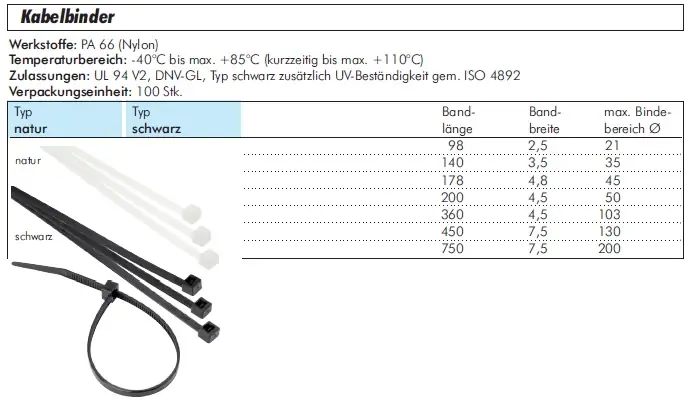Zulassungen: UL 94 V2, DNV-GL, Typ schwarz zusätzlich UV-Beständigkeit gem. ISO 4892