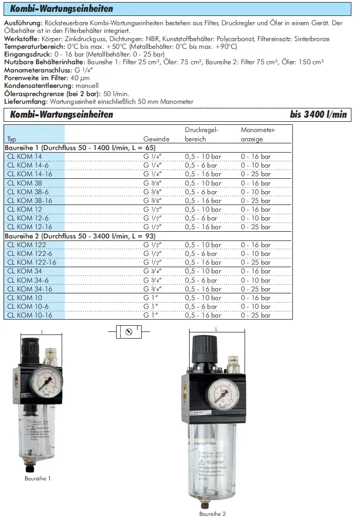 Werkstoffe: Körper: Zinkdruckguss, Dichtungen: NBR, Kunststoffbehälter: Polycarbonat, Filtereinsatz: Sinterbronze