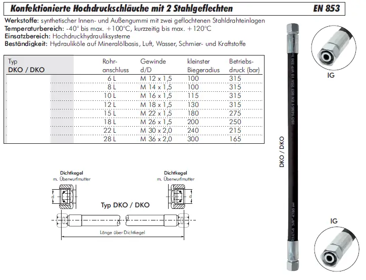Beständigkeit: Hydrauliköle auf Mineralölbasis, Luft, Vakuum (max. -0,38 bar gemäß SAE 100 R4), Wasser, Schmier- und Kraftstoffe