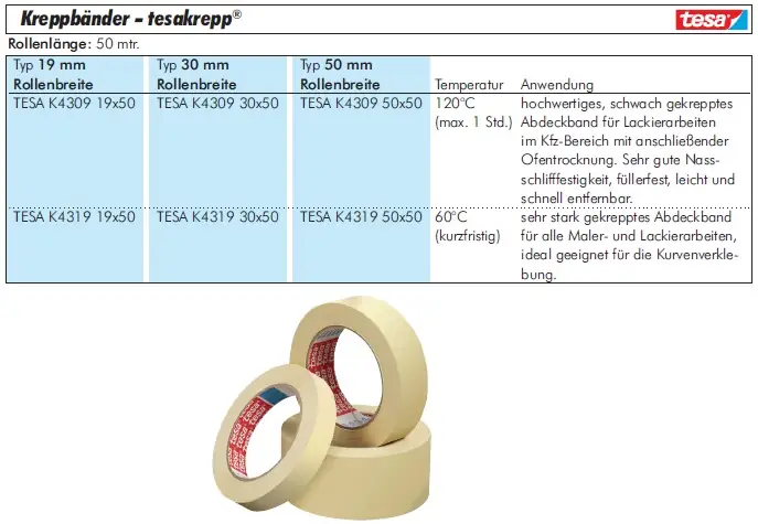 tesakrepp 4309: Hochwertiges, schwach gekrepptes Abdeckband für Lackierarbeiten im Kfz-Bereich mit anschließender Ofentrocknung. Sehr gute Nassschlifffestigkeit, füllerfest, leicht und schnell entfernbar. Temperatubeständig bis max. +120°C.