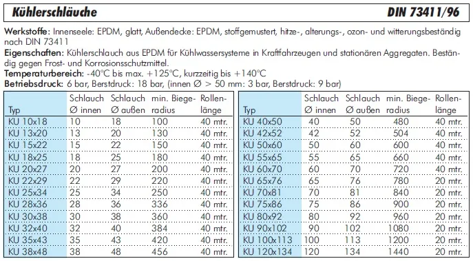 Eigenschaften:Kühlerschlauch aus EPDM für Kühlwassersysteme in Kraftfahrzeugen und stationären Aggregaten. Beständig gegen Frost- und Korrosionsschutzmittel.