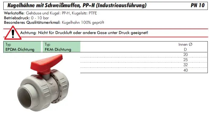 Werkstoffe: Gehäuse und Kugel: PP-H, Kugelsitz: PTFE