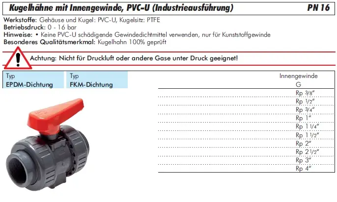 Werkstoffe: Gehäuse und Kugel: PVC-U, Kugelsitz: PE