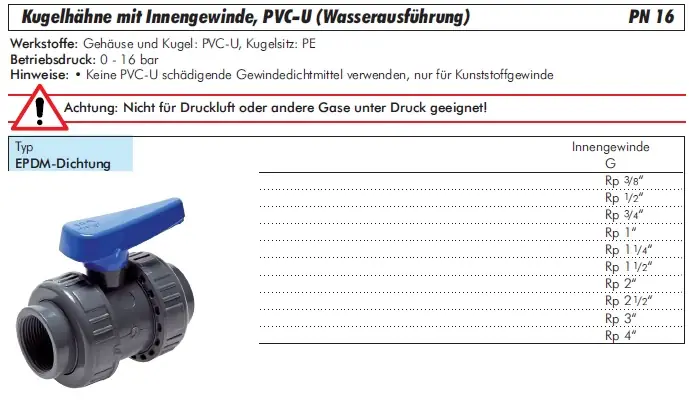 Werkstoffe: Gehäuse und Kugel: PVC-U, Kugelsitz: PE