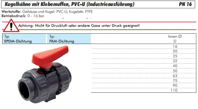 Werkstoffe: Gehäuse und Kugel: PVC-U, Kugelsitz: PTFE
