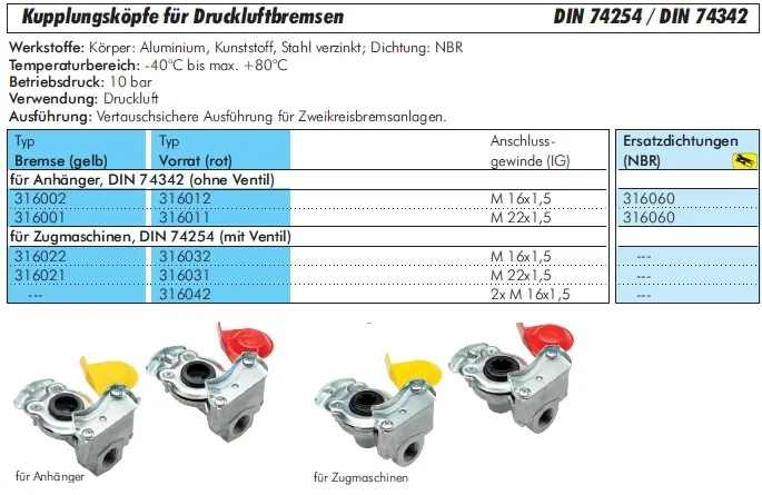 Gewährleisten Sie maximale Sicherheit im Straßenverkehr mit unseren Kupplungsköpfen für Druckluftbremsanlagen. Gefertigt nach den strengen Qualitätsnormen DIN 74254 und DIN 74342, bilden diese Komponenten die lebenswichtige Schnittstelle zwischen Zugmaschine und Auflieger bzw. Anhänger.