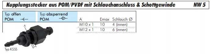 Optimieren Sie Ihre festen Geräteintegrationen mit dem Original Parker® Kupplungsstecker der Nennweite 5 mm. Dieses spezielle Modell kombiniert ein robustes Schottgewinde für die sichere Installation in Panels oder Gehäusewänden mit einer integrierten Schlauchtülle für den direkten, flexiblen Anschluss eines Weichschlauches.